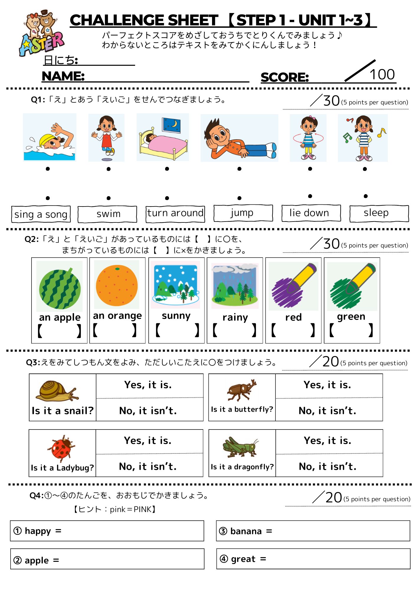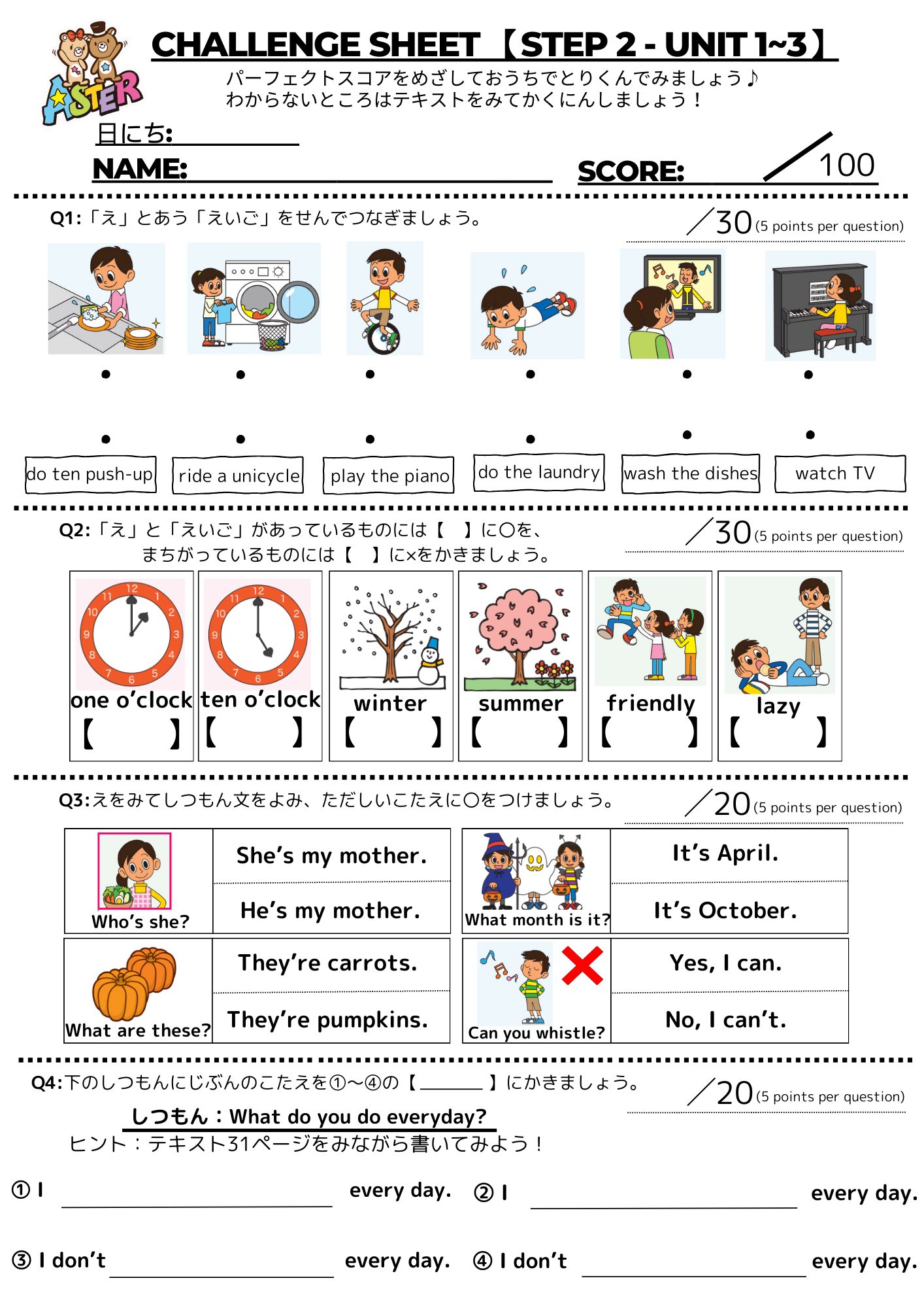 従来、各Unit終了ごとにレッスン内で実施しておりました確認テストですが、お子様の学習をさらに効果的に進めるために、要点をまとめ今週よりワークシートとして配布しております。パーフェクトスコアを取れるまで、実施期間1か月の間に、何度でも挑戦していただけます!