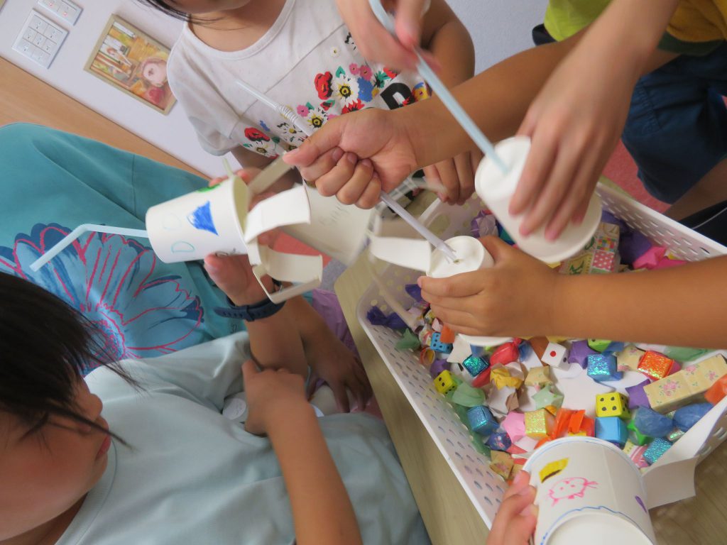 UFOキャッチャー作りでは、アームの数を2本、4本、5本など自分で決め、カップをどんなデザインにするか考えました。