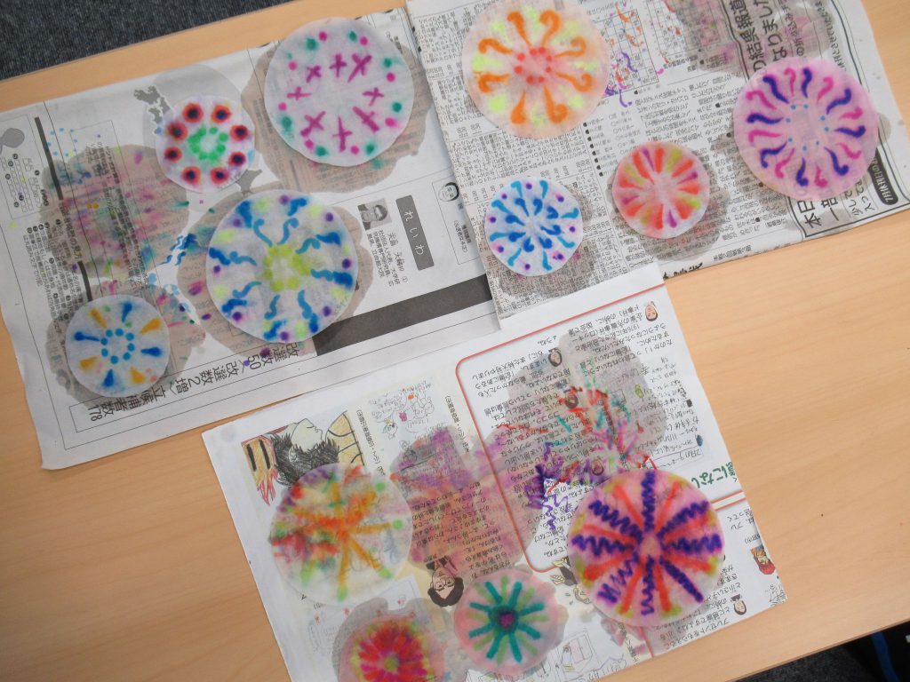 「ペーパークロマトグラフィー」では、水性ペンで描いた自分のデザインが、水につけるとカラフルに変わっていく様子に驚いていました。