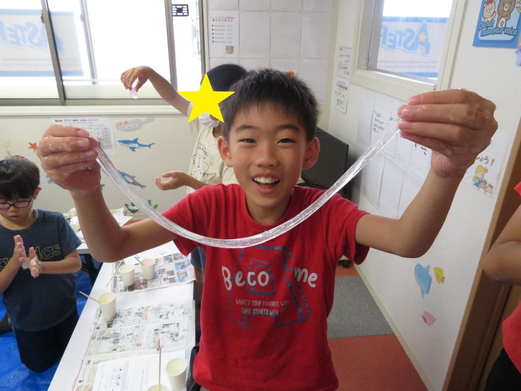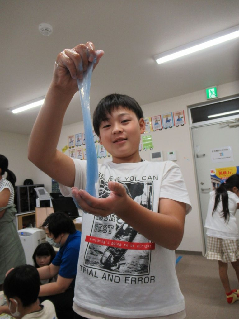 「Engineering」をテーマに、材料の配分も自分たちで決めたので、「のびた!」「かたくなった」など様々なスライムができました。