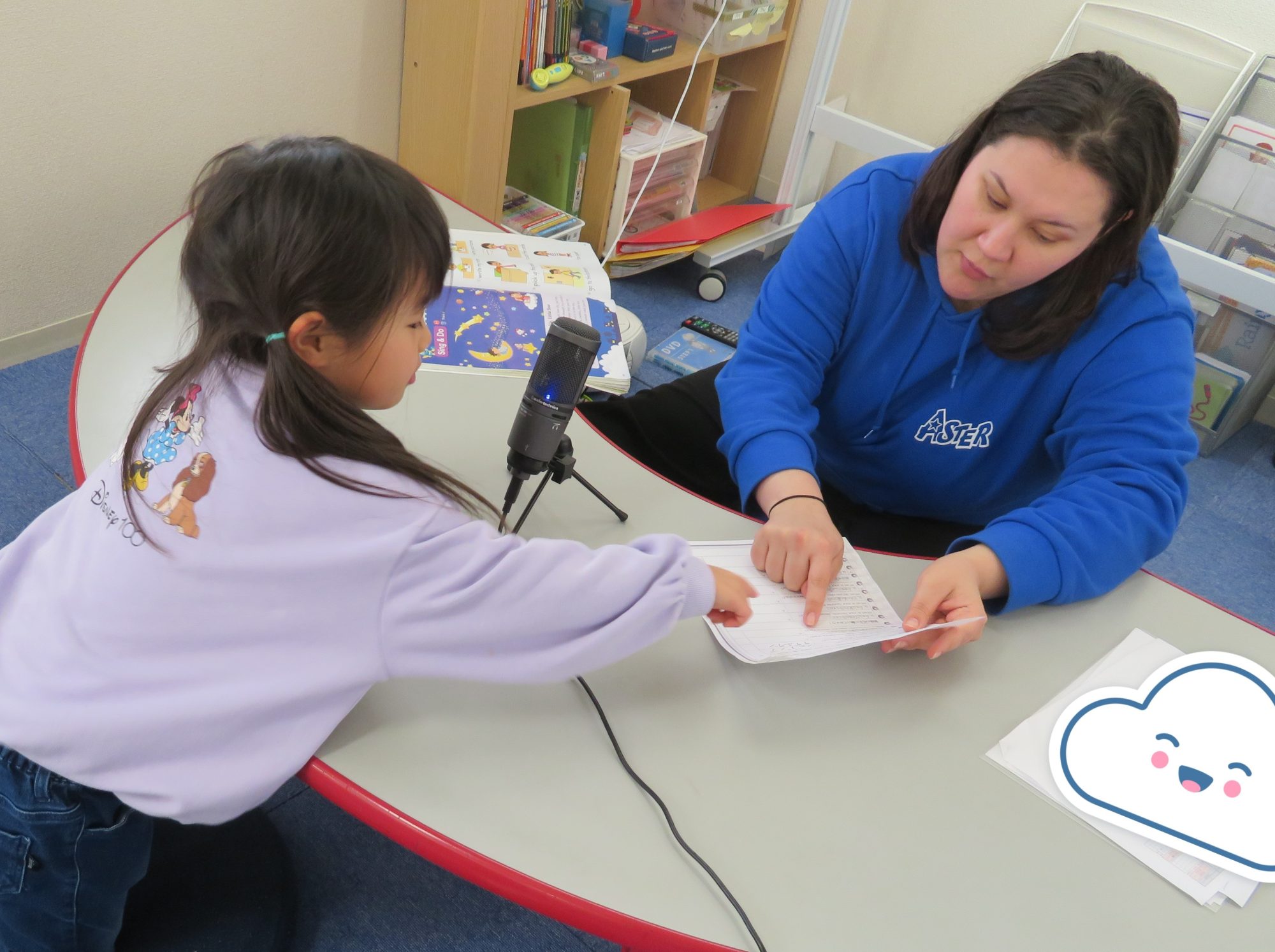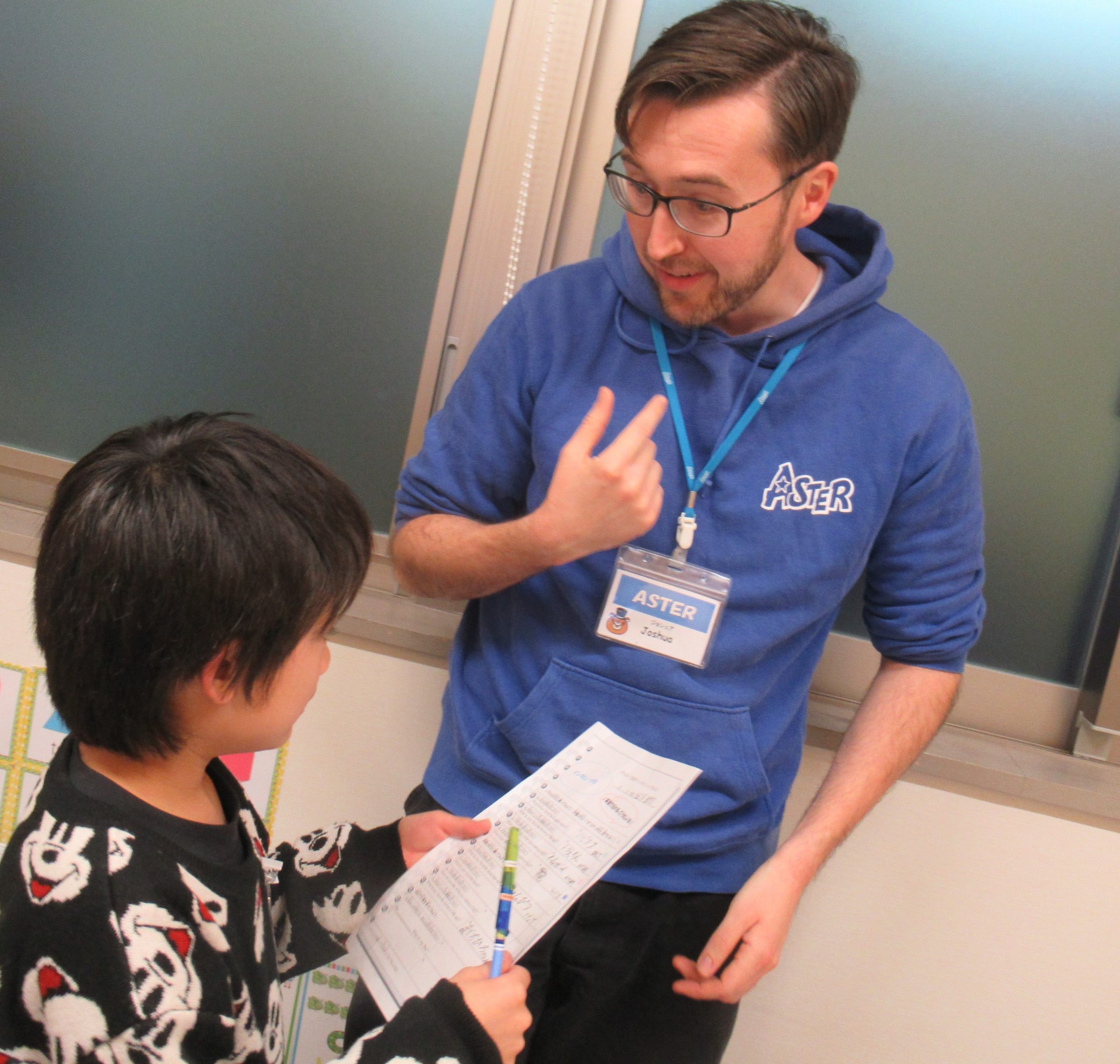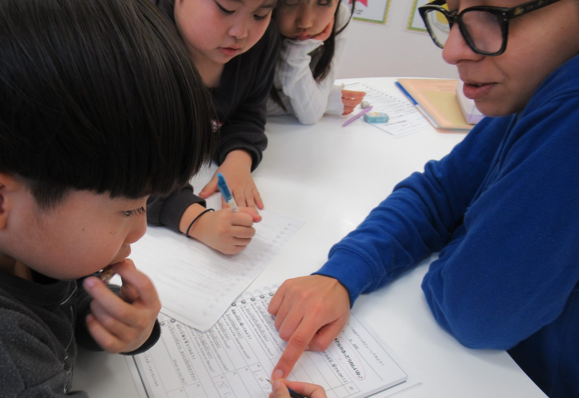 英語で先生たちに好きな漢字や子供の頃の遊びを聞いているみたいです♬